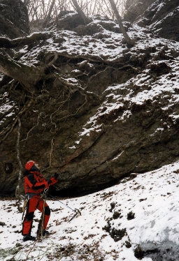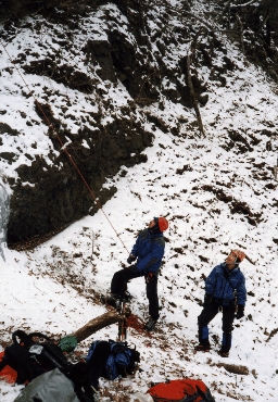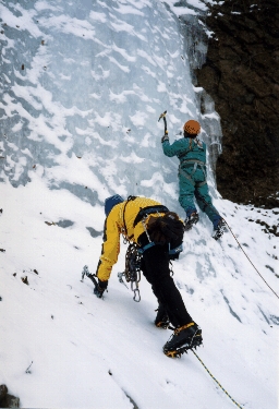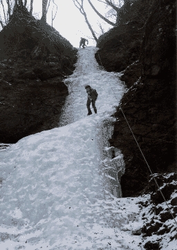 反面氷がもろく、特に上部からは大きなかけらが剥離しやすく、ビレーは氷瀑の端(と