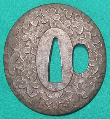 Tsuba 1 "Choshu Tomoaki" 6.8cm x 6.4cm x 4.2mm This is a beautiful tsuba with cherry blossoms design. Signature "Choshu Tomoaki saku", means "Nagato province, Tomoaki made". Tsuba bag 50,000.yen