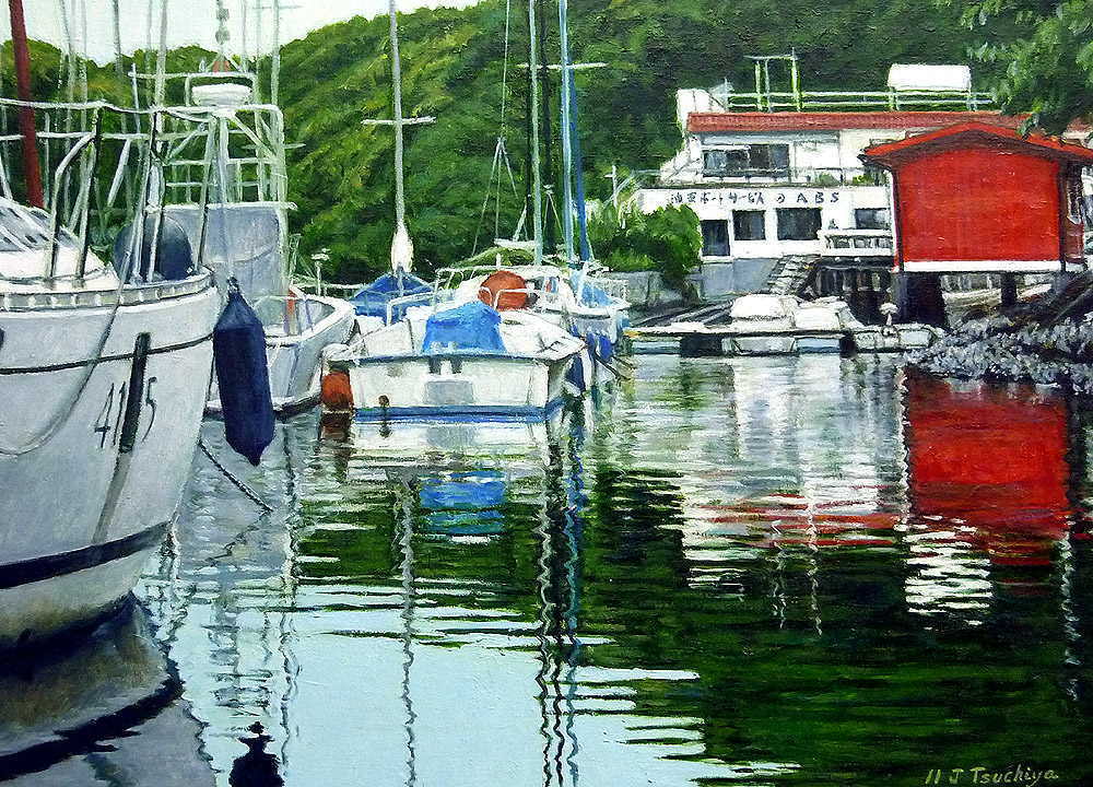 油壺 P20 2011年 3年前に友人とスケッチ旅行を した時のものを作品に仕上げました。 なかなか良いロケーションがなく 干潮で水面も低く水辺の広がりを 出せなくて苦心しました。