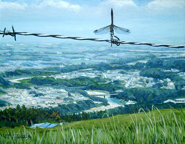 第18回八軌展での課題作品、今回で3回目の課題作です。今回の「飛」は皆とても悩んでいたみたいです。事前に話し合った時にまともに描くのは芸がないと言っていたのが頭に残っていて、構想だけで大変苦労しました。近くにある関東平野が一望の場所と牧場で鉄条網で休んでいるトンボを組み合わせました。トンボの姿勢が今にも大空絵飛び出すかのような緊張感が少しは出て居ますか?メンバーの評判は好評でした。この作品は構想9割製作1割と言うところでした。