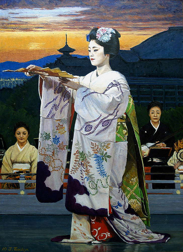 鴨川をどり10 F40 2010年 2010年八軌展出品 以前F4サイズで描いたものを 2年かけて大きな作品にしました。 背景に苦労しました。その後4年かけて F60号の大作に仕上げました。背景が まったく変わっています。 その作品