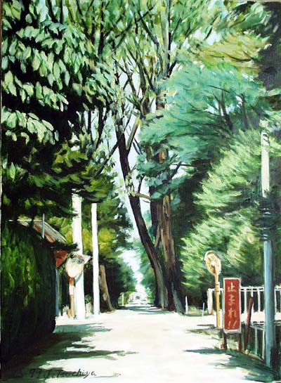 涼しい道 P20縦 1999年 ポプラのある小道、 ポプラ木は葉に清涼感があります。 私は北海道のおおらかな風景に憧れがあります。 埼玉の深谷にもこんな風景があるんですよ。 でも道幅が狭くとても比較になりません。