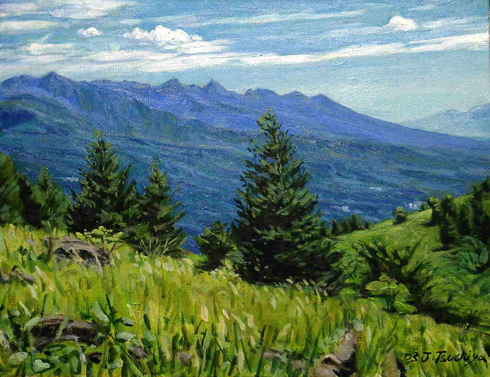 八ヶ岳 F6 2003年 第19回八軌展出品作品 蓼科高原の八子ヶ峰から眺めた 八ヶ岳、とても気持ちの良い天気で マツムシソウがいっぱい咲いて いました。蓼科山の登山口 すずらん峠より30分のところに あります。ここからの八ヶ岳は 長い裾野が綺麗です。