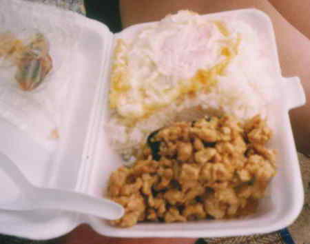 クラビで食べたバジルライス ご飯にバジルで炒めたチキンと 両面焼いた目玉焼きが載った 日本人にめっちゃあうお弁当 |