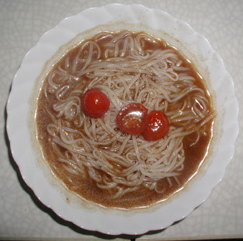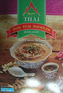 | トムヤムラーメン 3人分くらいの平たいビーフンを水で戻して、トムヤムペーストと 絡めてできあがり。具は入っていないので自分で準備する必要あり。 モヤシとパクチー、エビを入れればGOODでは?? |