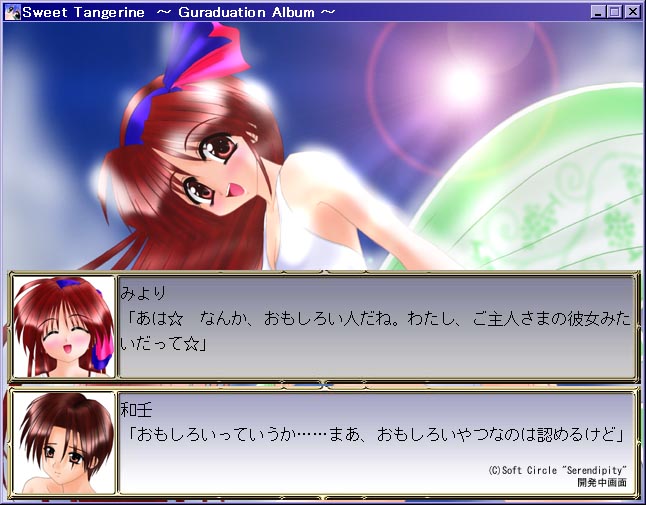 | サンプルCG: 表ジャケット 裏ジャケット (会場でSerendipityのブースをお探しのさいに目印にどうぞ) 本作品のCG(Web向け)は「Galley(一般)」で公開しています。 画面キャプチャー3、画面キャプチャー4 (この画面は開発中のものです。キャプチャー1、2は公開を終了しました) |