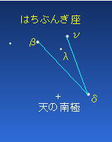 | ・σ星:天の南極にいちばん近い、肉眼でも観測できる星です。正確には天の南極からは1度 離れています。但し明るさは5.5等級と決して明るいとは言えず、あまり目立ちません。 ・λ星:離角の小さな二重星です。小型の望遠鏡を使って観測すれば、分離することができる でしょう。明るさは5.5等級と7.2等級です。 |