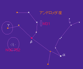 | ★南中位置での見つけ方 まずは2等星のα星から見つけていきましょう。 1.最初に、天頂付近に高く昇った、アンドロメダの頭の星、α星を見つけて 見ましょう。 真南を向いたら、げんこつ8っ半上を見上げます。ペガス スの四辺形の北東角の星がそれです。 2.次にα星を手がかりに、胴体の部分を探しましょう。 α星を頂点に、北東(左上)に向かって、げんこつ三つの細長いA字形に 星が並んでいます。南(下)側の線の星は、2等星が並んでいますが、 もう一方の線は4等星ばかりです。 3.最後に手の部分を探してみましょう。 α星の東(左)にげんこつ半分くらいのところにある3等星から、北西 (右上)にげんこつふたつのところにある、3個の4等星が右手を表して います。左手は南(下)にげんこつ1つのところにある、5等星です。 |