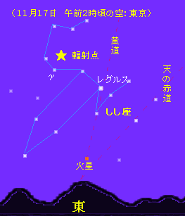 | 11月17日前後に出現するしし座流星群は、普段は余り多くの流星は見られ せんが、33年周期で活発な大出現があり、時には数十万個の流星が雨のように 降り注ぐ流星雨となることで知られています。 前回は1965年と1966年 に大出現があり、次回は1998年か1999年に大出現するのではないかと、 期待されています。 |