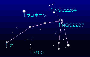 【M50】 いっかくじゅう座の散開星団 M50(NGC2323)は、いっかくじゅう座に属している、比較的小型の散開星団です。 距離は2600光年で、約100個ほどの星が集まっていて、肉眼で見ても星雲上の姿を、 観察することが出来ます。 双眼鏡を使って眺めてみると、星雲状の光を背景として数個の明かるい星が輝いている のが見えてきます。