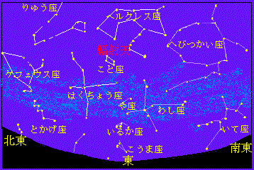 | 七夕の織り姫星ベガのあること座は、4月下旬になると夜半前には、北東の 空に姿を見せ、夜明け前に頭上高くに昇ります。そのこと座を輻射点に持つ こと座流星群が4月の22日頃に極大になります。出現率は、一時間に5〜 8個くらいですから、見付けやすいと思います. |