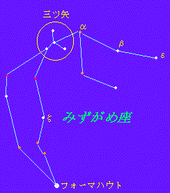 | ★南中位置での見つけ方 1.先ずは真南に昇った、3等星のα星を見つけましょう。 真南を向いたら、げんこつ5個半分上を探します。α星から南西(右下)の 方向に、げんこつひとつの間隔で2等星のβ星と、3等星が並んでいます。 この部分が、水瓶を担ぐ腕です。 2.次は水瓶の口に当たる、三ツ矢のマークを探してみましょう。 α星の東(左)げんこつ半分の所に、4等星のζ星を中心に、3つの4等星〜 5等星が、直径5度の大きさの三ツ矢のマークの形に並んでいる。 3.最後は水瓶から流れ出た水の流れです。 三ツ矢のマークから、みなみのうお座のフォーマルハウトに向けて、大きく 東(左)に蛇行するように、4〜5等星が連なっています。 | |||
