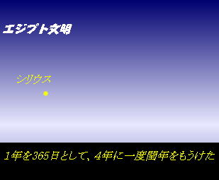 | 古代文明はどれも、大河の流域に栄えましたが、その中でもナイル川流域に栄えた エジプト文明と、チグリス、ユーフラテス川流域に栄えたメソポタミア文明では、天文 学がとても重要な役割を果たしていたことが、解っています。 エジプトでは、おおいぬ座の-1.5等星シリウスが日の出直前に昇る時期と、洪水が はじまる時期が、ちょうど一致していました。このことは紀元前3000年頃には、すでに 知られていたと言います。エジプトにおいて洪水は、上流の栄養分を含んだ土を、 下流へと運んび、やせ細ってしまた下流の土地を、蘇らせてくれるものだったのです。 ですから、洪水の過ぎたあとに種をまけば、豊かな実りが約束されたのです。 このようなことから、洪水の時期を知ることは、とても重要であったのです。 そこで この洪水の時期を一年の始まりとして、1年が365日であると決めました。4年ごとに 1年を366日とする閏年をもうけたのも、古代エジプト文明だったのです。 紀元前2000年頃になると、エジプトでは太陽の動きから、メソポタミアでは月の動き から、それぞれ暦が作られました。 メソポタミアで作られた暦は、1年を12ヶ月に分け るもので、それはそのまま、現在にも引き継がれています。 |