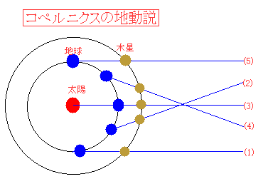 | ギリシャ時代の後、キリスト教がヨーロッパを支配して、天動説を 真実として、これ以外の考え方を、いっさい認めようとはしません でした。 15世紀になって北イタリアからルネサンスが始まると、これに 呼応するように16世紀、ポーランドの神父コペルニクスは、太陽 が宇宙の中心で、地球をはじめとするすべての惑星がその周りを まわっていると考えれば、惑星の逆行現象などの、複雑な惑星の 動きも、簡単に説明できることを示しました。 太陽の周りを回る惑星の動きを公転といいます。逆行する火星・ 木星・土星は地球よりも、太陽から遠くを公転して、地球よりも 太陽の周りを一周するのに時間が掛かるとすると、地球がそれらの 惑星を追い越すことがあり、この時に地球から惑星が逆行する様に 見えるのだと、説明をしました。 |