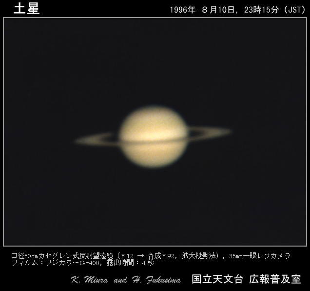 ●土星の観察 古代の天文学者達にとっては、土星が最も遠い惑星でした。しかし実際には太陽系で 木星に次いで大きな惑星で、赤道付近にある、幅の広い特徴的な環のお陰で、望遠鏡でも 見つけるのは、比較的簡単でしょう。 土星も木星と同様にその表面は雲状の大気に覆わ れていて、そのしたには液体水素とヘリウムの内部構造があります。 土星は18個の衛星を持っていて、この数は太陽系の惑星の中で、最大です。 大きさは、直径が120,500kmで地球の約9倍もあります。 |