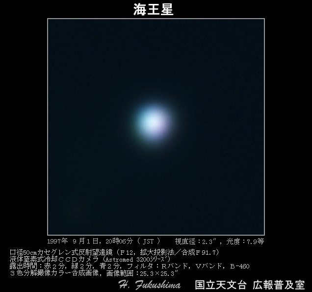 ●海王星観測のポイント 海王星は最も明るいときでも、8等級にしかならないので、残念ながら肉眼で観測することは、 出来ません。双眼鏡を使えば暗い星のような姿を、確認することができます。見つけた星が本 当に海王星であるかを、確認するためには、数日間に渡って観測を続けて、恒星の間を、徐々に 移動するのを確認します。 |
